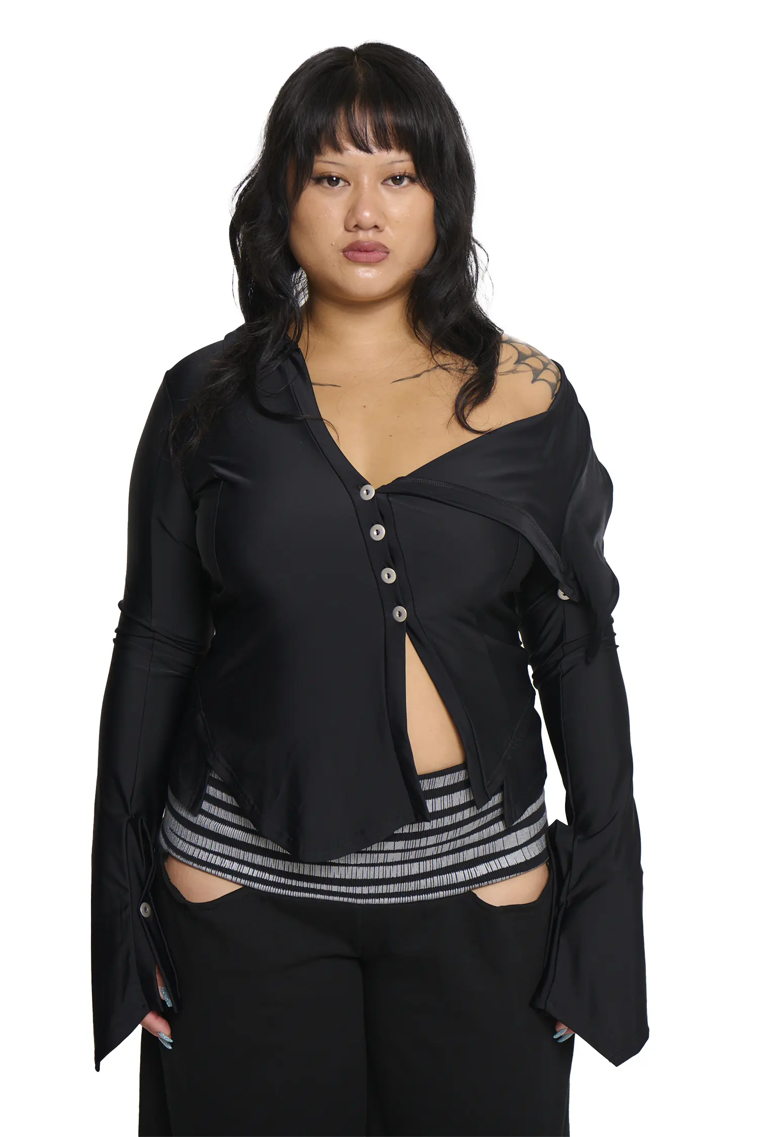 Lightweight Lycra button up shirt, open neckline with extended lapel designed to drape over the shoulder. Buttoned cuff opening. Added side panels to give the effect of a shirt under a shirt.