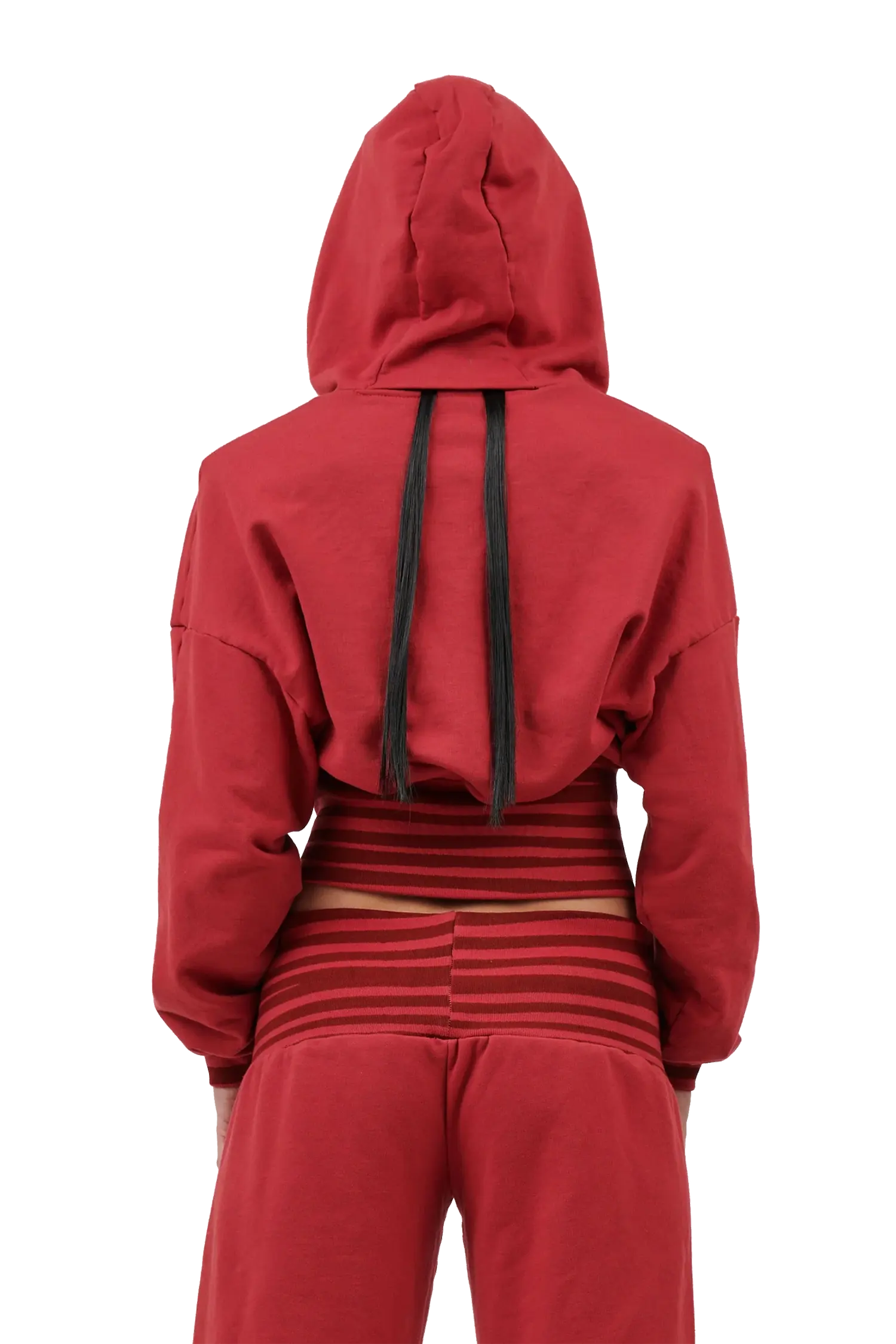 The boxy fit and shoulder pads accentuate the structure of the body, balancing sharpness with ease. A thoughtful detail sits at the back of the hood — a slit at the neckline that allows long hair to be fed through comfortably.