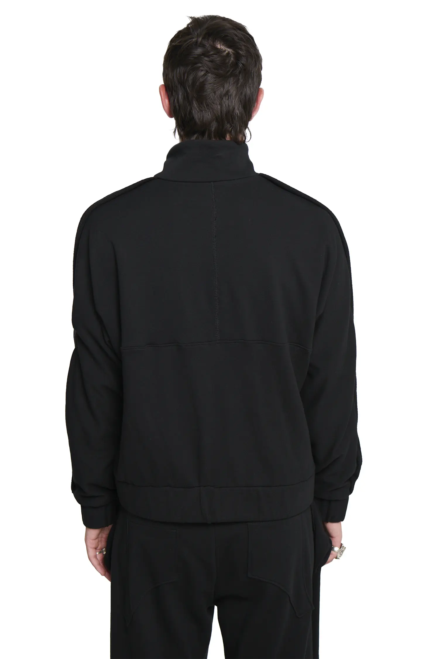 Tracksuit jacket reimagined, blending sportswear functionality with sculptural tailoring. Designed with a stand-up collar and panelling running down the arms, the silhouette is structured yet relaxed, offering effortless movement. An exposed double-ended centre front zip provides versatility, while a detachable silk dupion patch with snap studs adds a tactile, artisanal contrast—perfect for layering or styling as a statement piece.