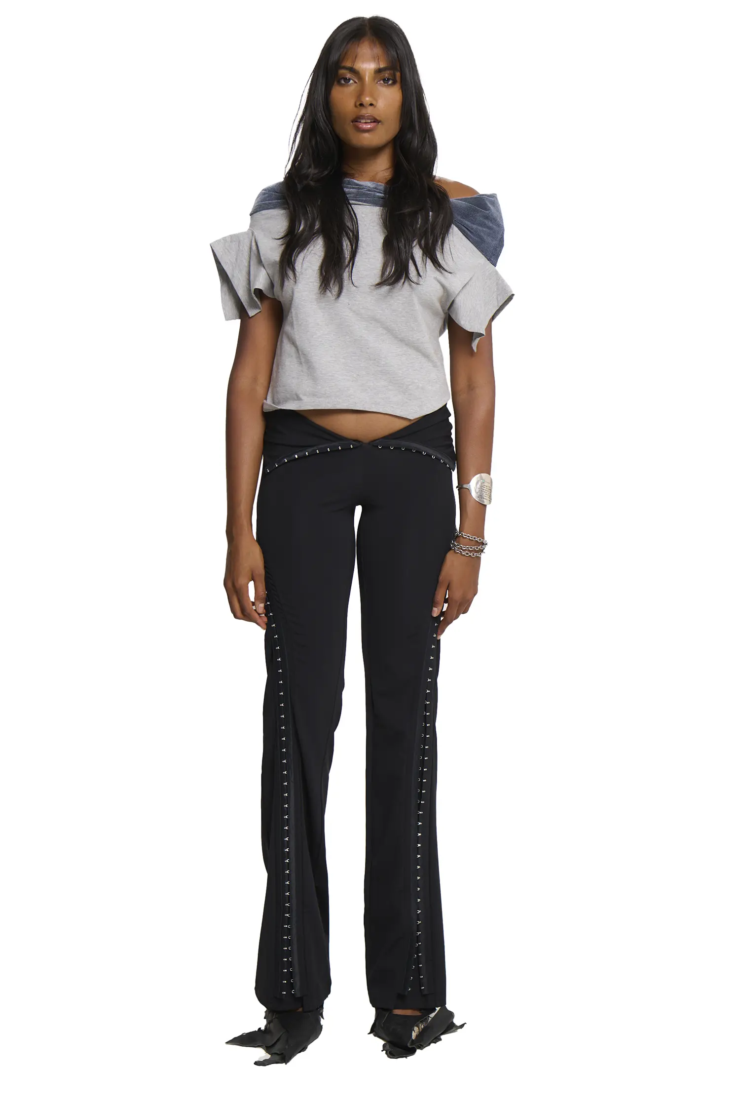 Front hook and eye closure that can be worn between high rise and low rise. Side hook and eye detailing. Pants can be worn shorter by moving hook and eyes around.