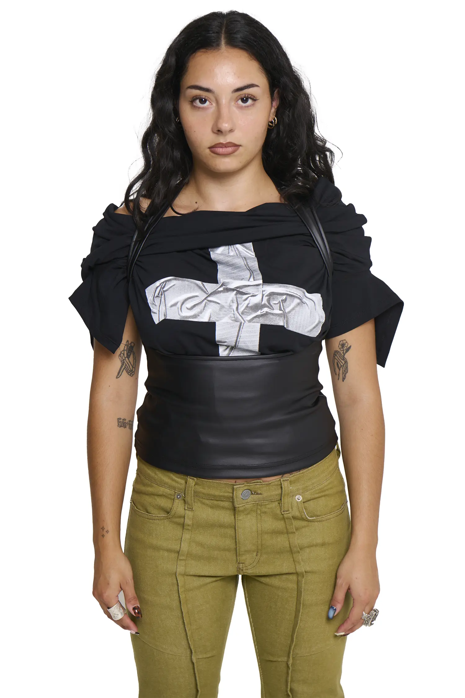 Short sleeve. Straight fit from chest down. Gaffa tape print. Can be worn several ways on the neckline for options.