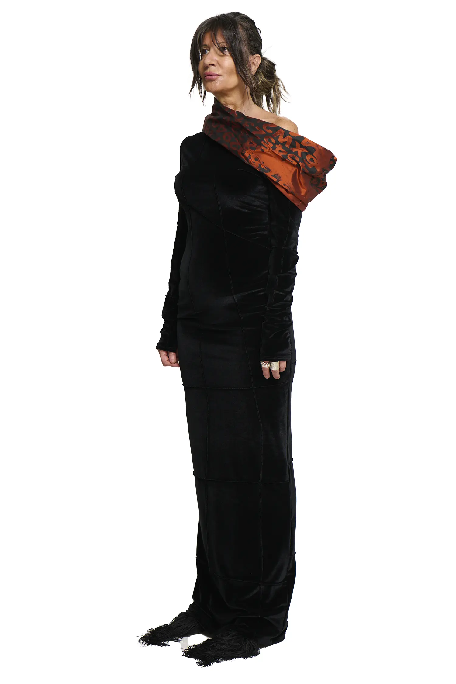 A maxi-length dress designed with long sleeves and a fluid silhouette.